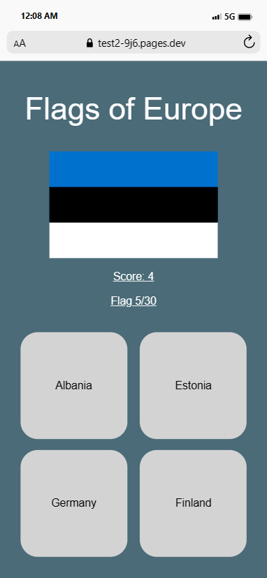 The game is really simple. First, you need to select a game mode. To do this, just click on one of the three category buttons on this page and select a game mode. Before the game starts, you can select the amount of flags you want to play with and decide whether to include dependencies and/or states with limited recognition. After the game starts, you will be shown one flag at a time and 4 options to chose from (see image above). When there are no flags left, the game ends and you can either play again or come back here to the main menu to select another game mode.